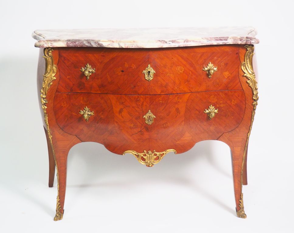 Commode de style Louis XV en marqueterie, à décor de fleurs, ornementation de bronze, ouvrant à deux tiroirs sans traverse, dessus marbre brèche. Dim. 82 x 46,5 x 108 cm