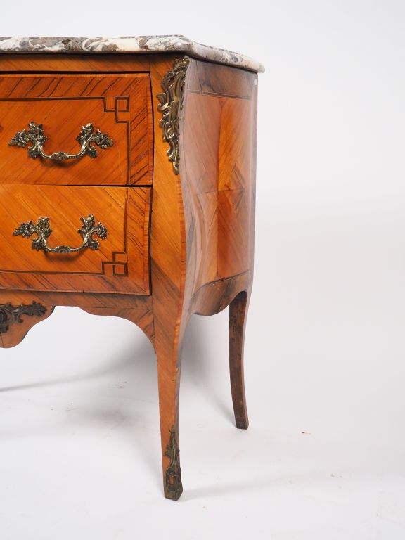 Commode de style Louis XV en marqueterie, ouvrant à deux tiroirs, dessus marbre brèche. Dim. 83 x 47 x 80 cm