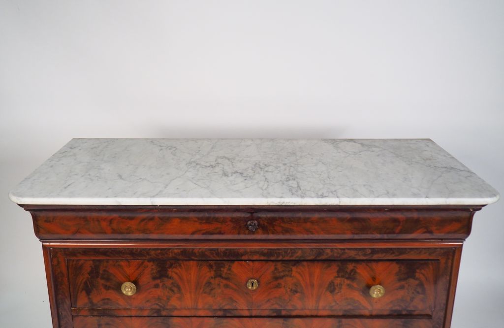 Commode Louis-Philippe en acajou et placage d'acajou flammé, dessus marbre blanc ornementation de bronze, ouvrant à quatre tiroirs et un tiroir à doucine. Dim. 95 x 128 x 56 cm.