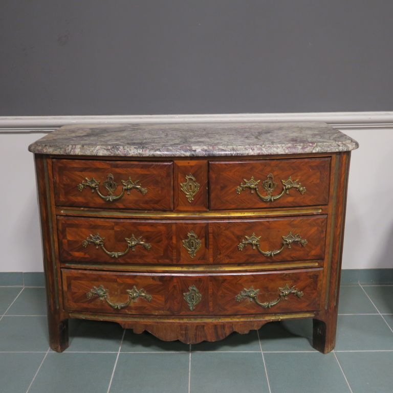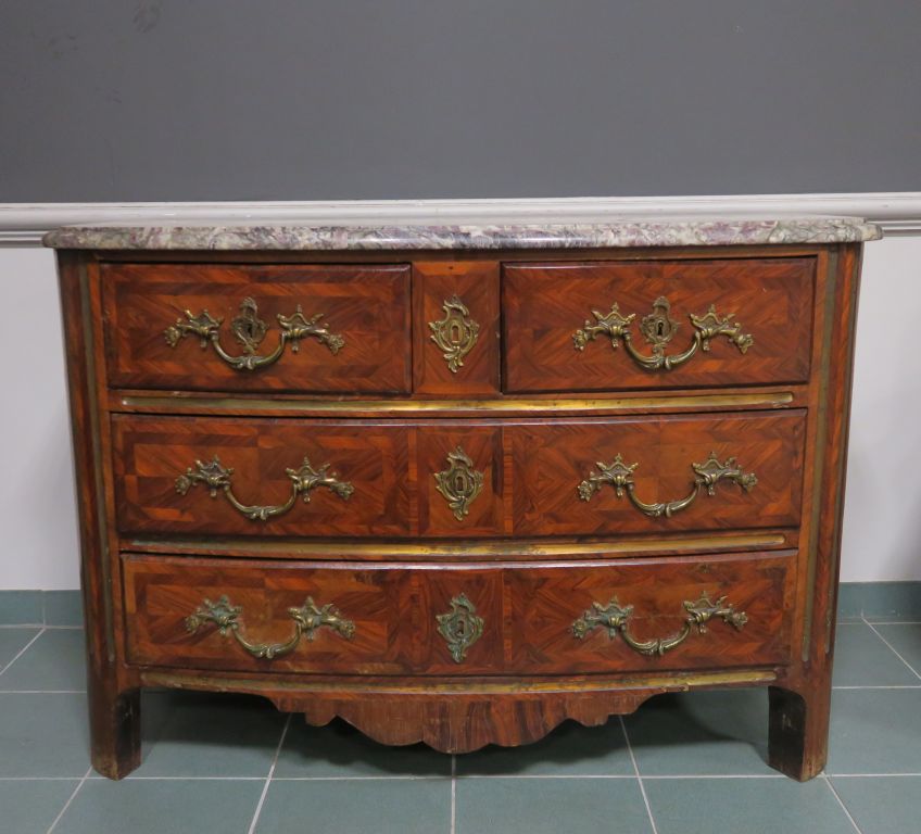Commode Régence en marqueterie, ouvrant à quatre tiroirs sur trois rangs, dessus marbre brèche. Dim. 62 x 90 x 130, cm (accidents)