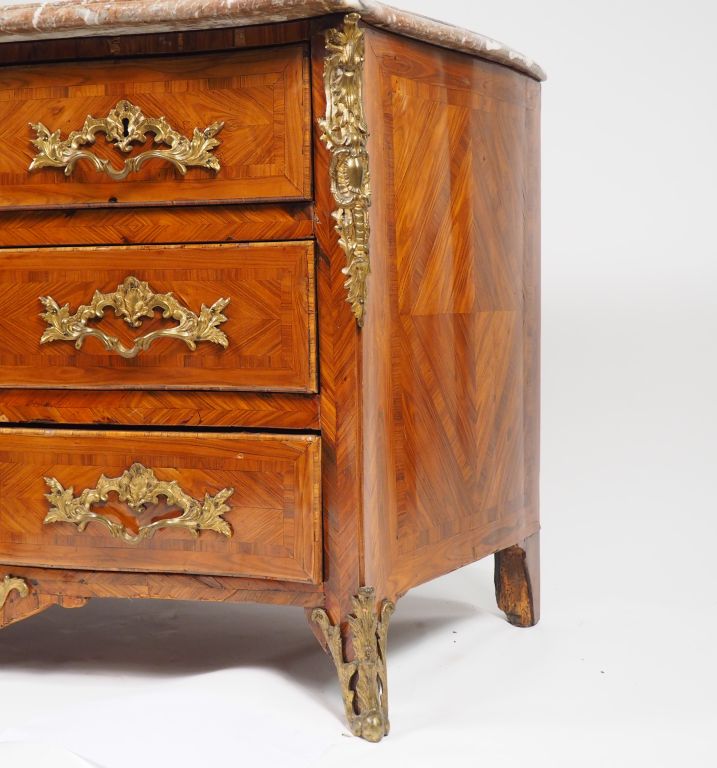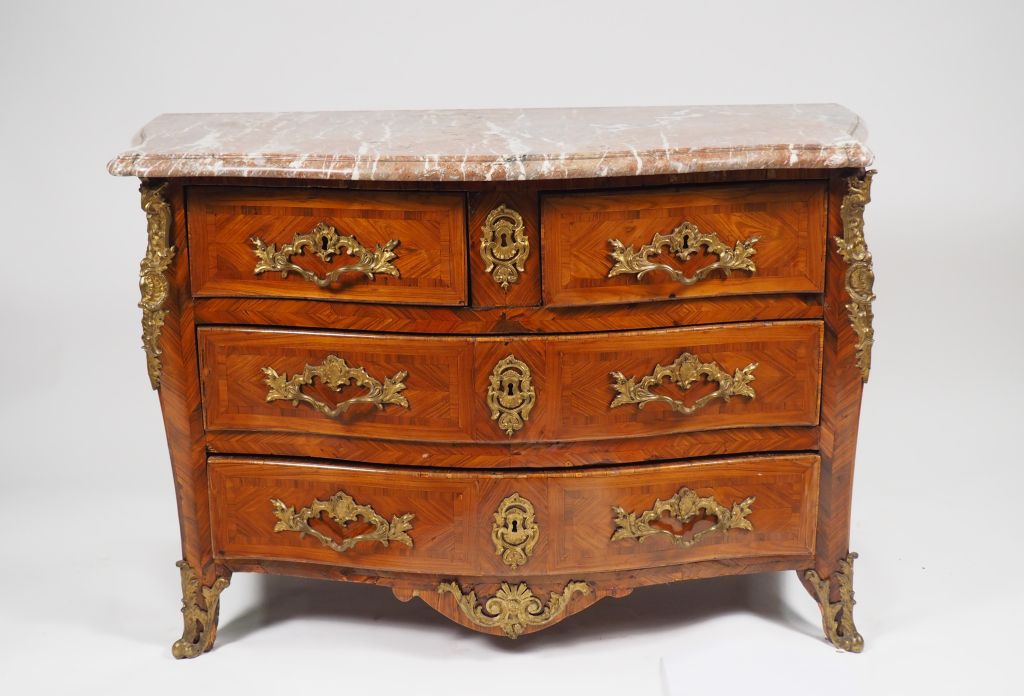 Commode Régence en placage de bois de violette ouvrant à quatre tiroirs sur trois rangs, ornementation de bronze, dessus marbre rosé. Estampillée Oudin. Poinçon de Jurande. Dim. : 83 x 129 x 67 cm