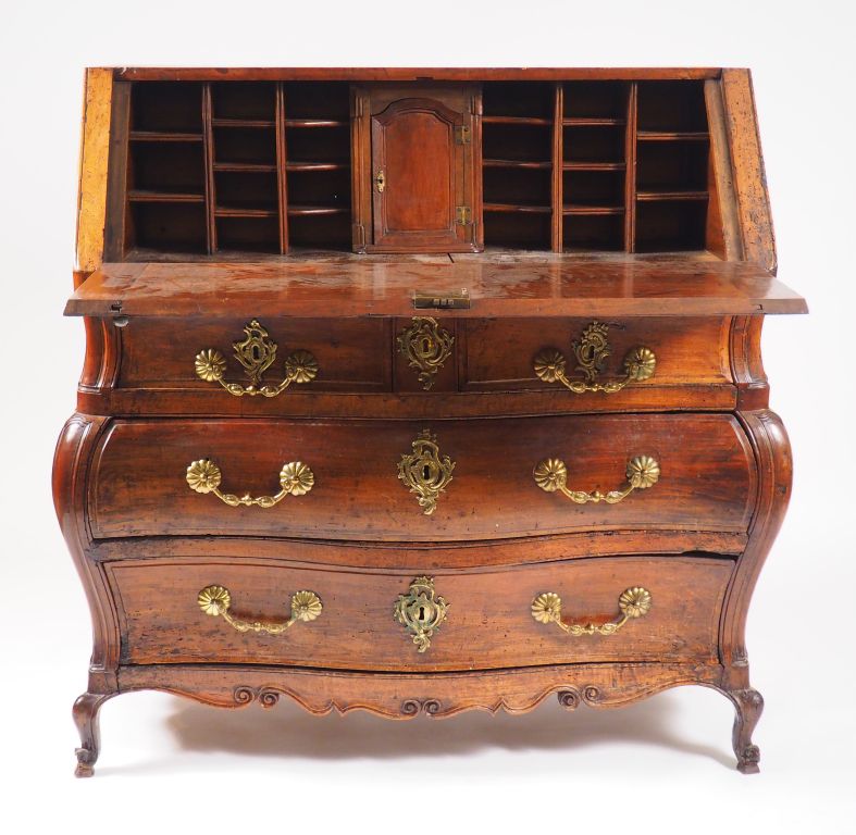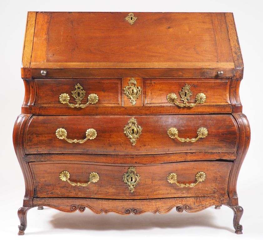 Commode scriban Louis XV en noyer mouluré, ouvrant à un abattant et quatre tiroirs sur trois rangs, ceinture sinueuse, pieds coquille, ornementation de bronze. (accidents et restaurations) H. 125 cm, L. 115 cm, P. 60 cm