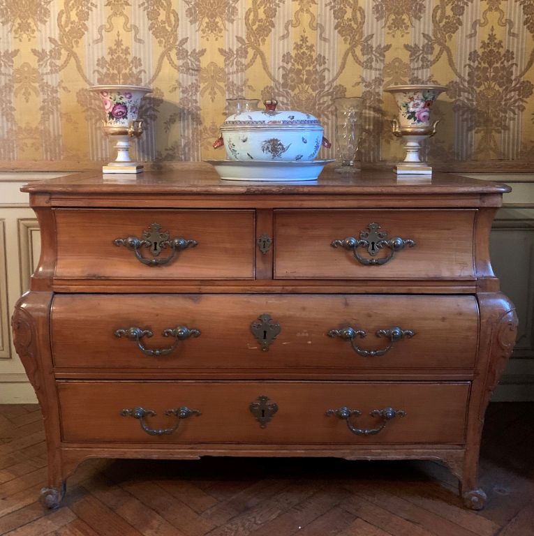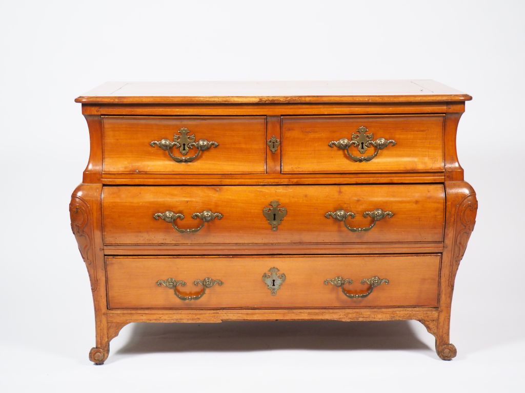 Commode tombeau Louis XV en merisier, ouvrant à quatre tiroirs sur trois rangs, pieds coquille, dessus bois, poignées de tirage et poignées latérales en bronze. Dim. 86 x 120 x 66 cm