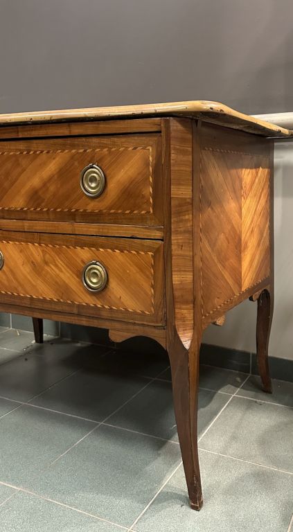 Commode Transition en marqueterie, ouvrant à deux tiroirs, dessus marbre brèche.