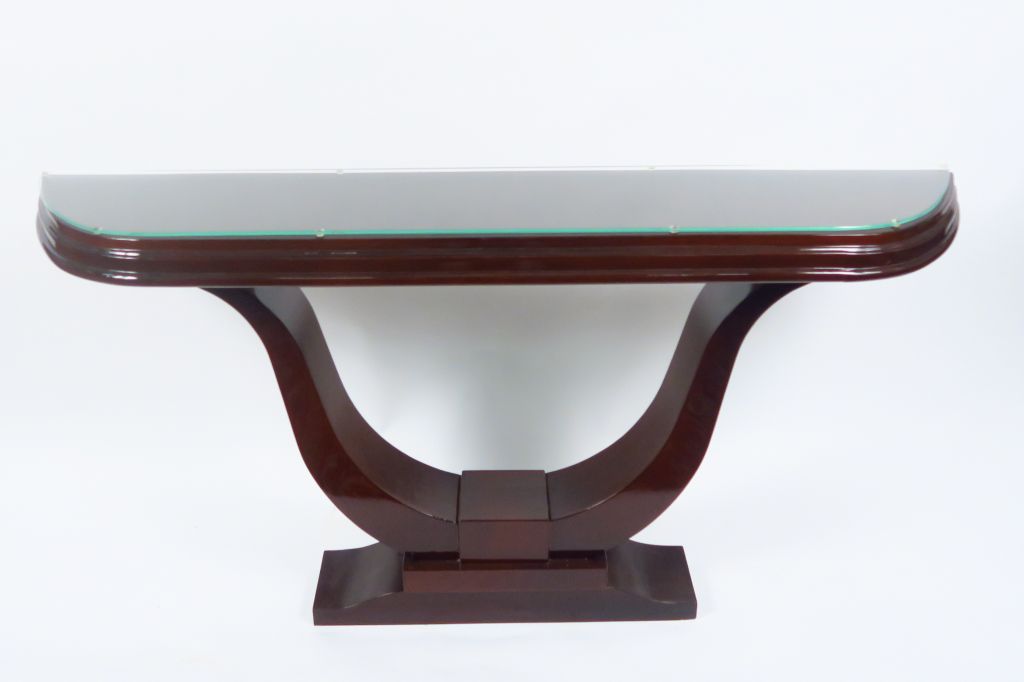 Console de style Art déco en acajou et placage d'acajou. 81 x 151 x 26 cm