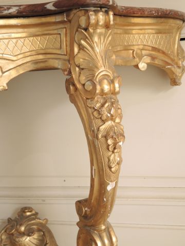 Console de style Louis XV en bois et stuc doré, à décor de palmettes et de fleurs, pieds à consoles affrontées réunies par une entretoise, dessus marbre rouge.