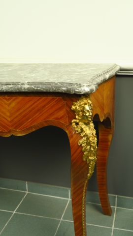Console de style Louis XV en marqueterie, ornementation de bronze doré. Dessus marbre gris.
