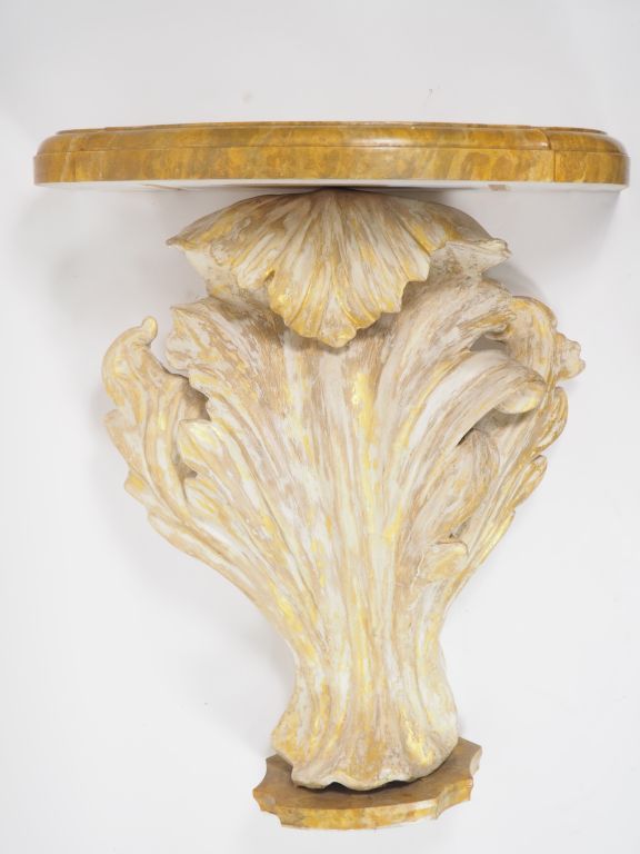 Console en bois polychrome et stuc, piétement en forme de grande feuille d'acanthe. 97 x 80 x 42,5 cm.