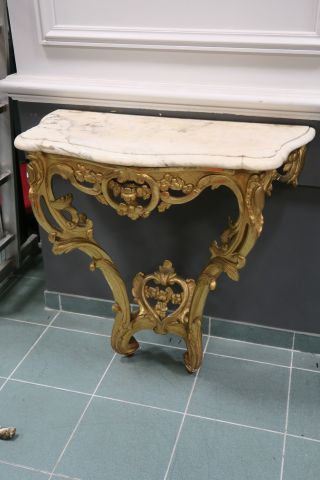 Console Louis XV en bois sculpté et doré à décor de feuillage et de fleurs, dessus marbre blanc