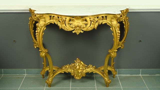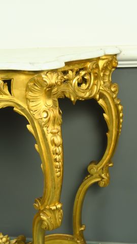 Console Napoléon III à quatre pieds de style Louis XV en bois sculpté, doré et ajouré, à décor de palmettes, de feuillage et de rocailles. Dessus marbre blanc.