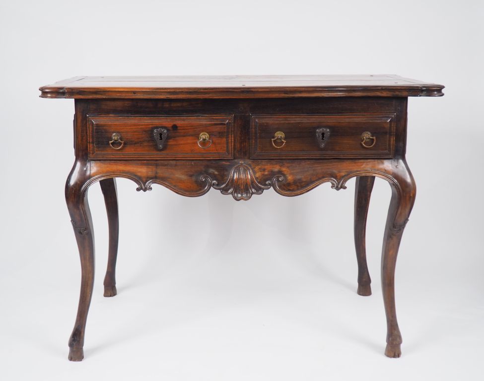 Console XVIIIème en bois exotique massif ouvrant à deux tiroirs, ceinture mouvementée, pieds galbés terminés en sabots de biche. Dim. 91 x 123 x 58 cm