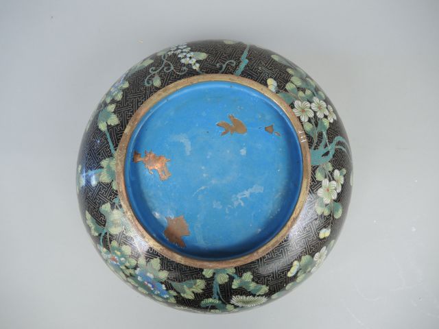 Coupe 1900 en émaux polychromes cloisonnés, à décor de fleurs, d’oiseaux et de papillon. Chine, vers 1900.