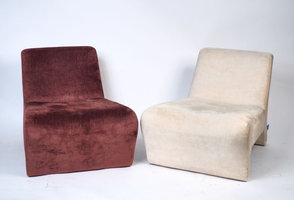 CRACK BY MACHANKE. Paire de chauffeuses garniture de velours aubergine et beige.