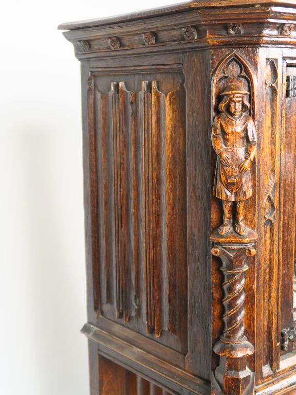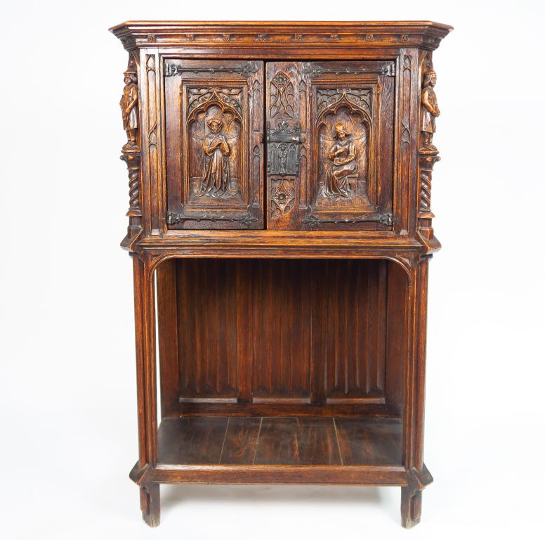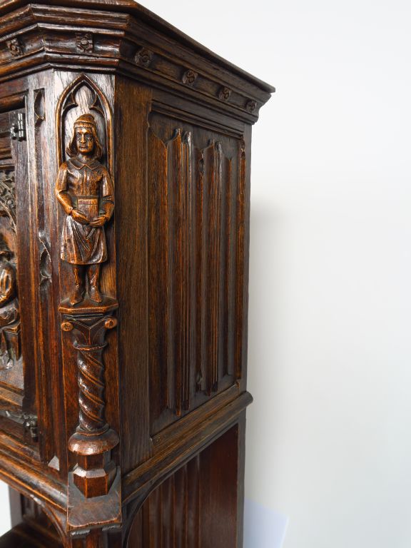 Crédence de style gothique en chêne sculpté, à décor de personnages. 137,5 x 89 x 43,5 cm
