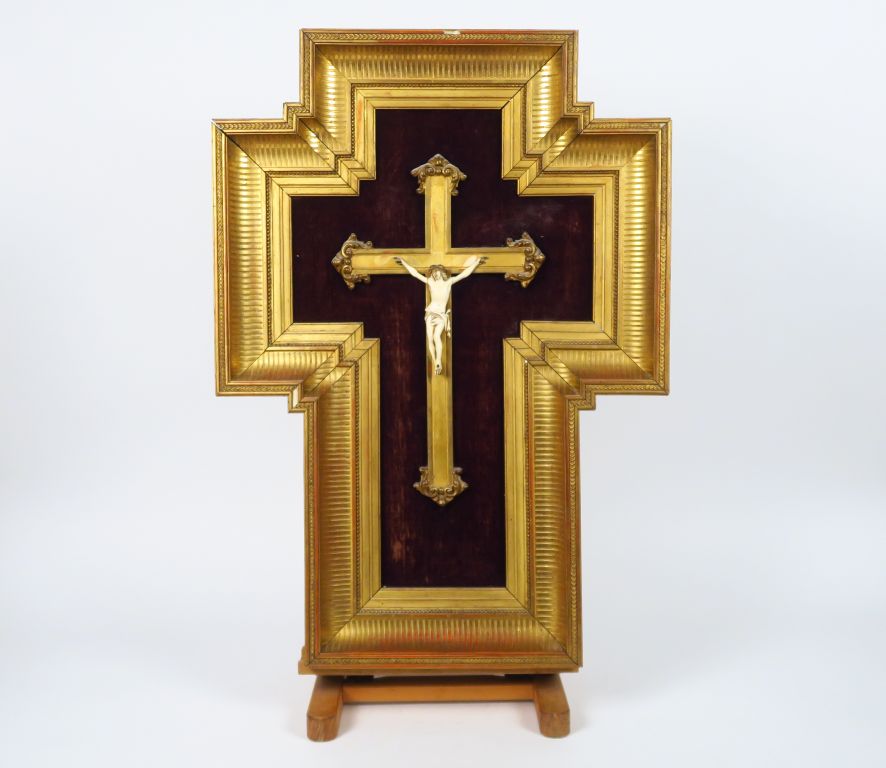Crucifix XIXème en ivoire sculpté. Dans son cadre en bois doré en forme de croix. 72 x 51,5 cm