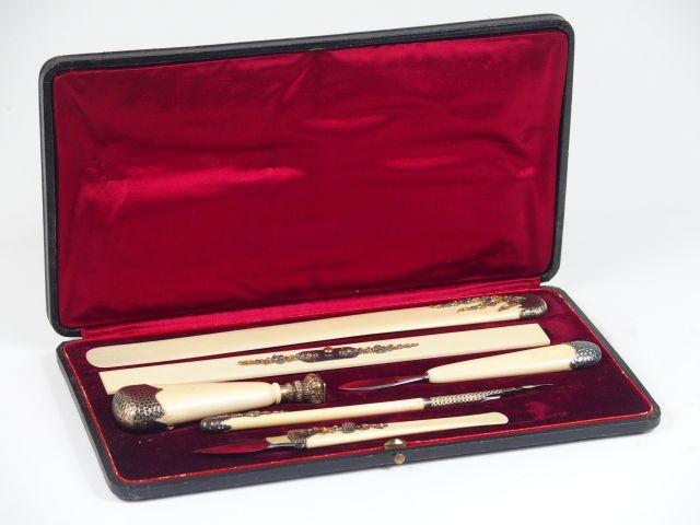 Dans son coffret d'origine : un nécessaire de bureau de style Louis XVI fin XIXème : 5 pièces