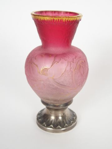 DAUM. Vase balustre en verre givré mauve et doré, à décor gravé en camée à l'acide de pavots. Piètement en argent, poinçon Minerve, de style rocaille. H. : 12 cm