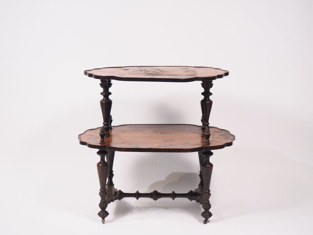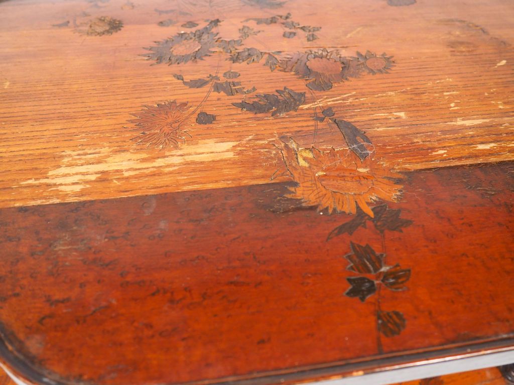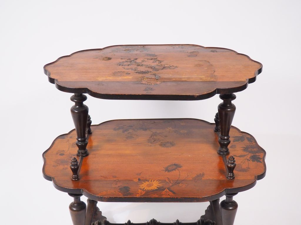 Desserte fin XIXème en marqueterie, à décor de fleurs, deux plateaux (manques et accidents). Dim. 81 x 86 x 64 cm