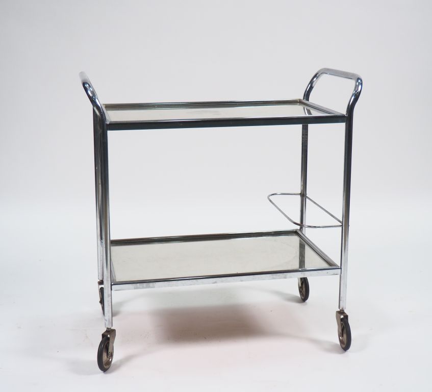 Desserte roulante années 50 en métal chromé et verre, à deux plateaux. Dim. 67 x 66 x 37,5 cm