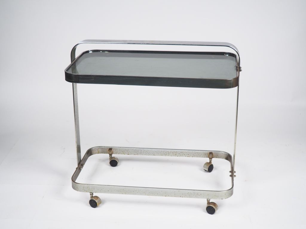 Desserte roulante années 70 en métal chromé, deux plateaux en verre fumé (un manquant) Dim. 69,5 x 71,5 x 41,5 cm.