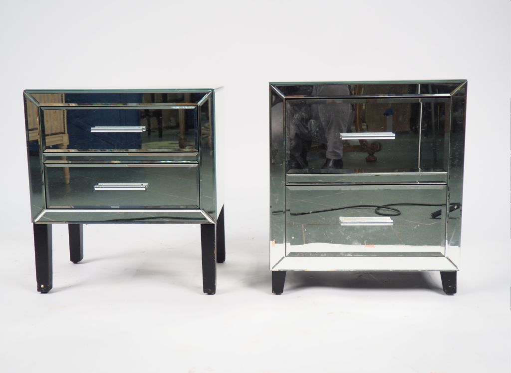 Deux chevets modernes en bois et verre, ouvrant à deux tiroirs. Dim 51,5 x 45 x 31 cm