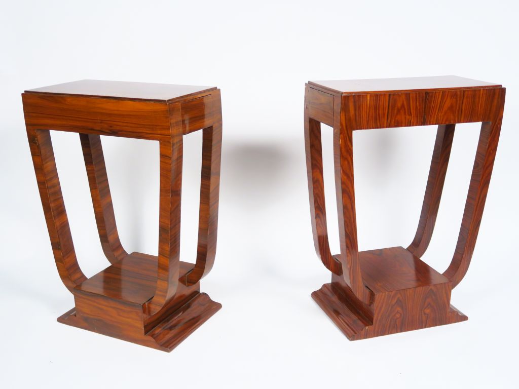 Deux consoles Art déco formant pendant en noyer et placage de noyer. Ouvrant à deux tiroirs latéraux, dessus bois. 83,5 x 58,5 x 29,5 cm et 84 x 59 x 30 cm (quelques sauts de placage)