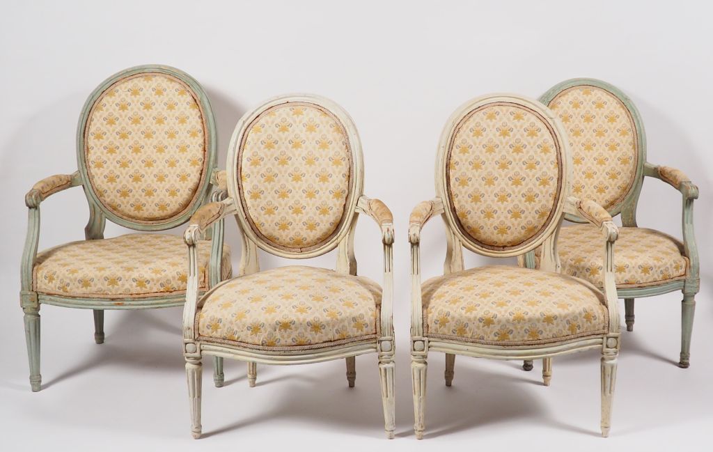 Deux différentes paires de fauteuils Louis XVI en bois rechampi blanc et bleu, dossier médaillon.