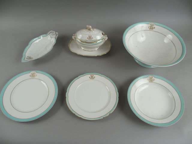 Deux parties de service de table Napoléon III en porcelaine, à décor de liserés bleus, noirs et dorés, monogrammés