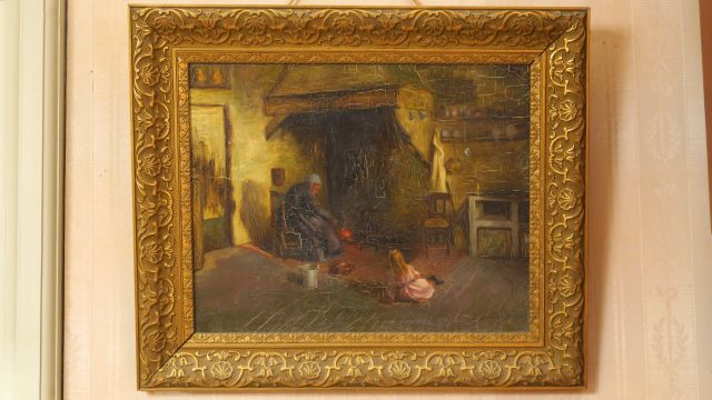 DEVILLE – CHABROL « Fillette et sa grand-mère près de l’âtre » Huile sur toile, signée en bas à droite 32 x 40 cm