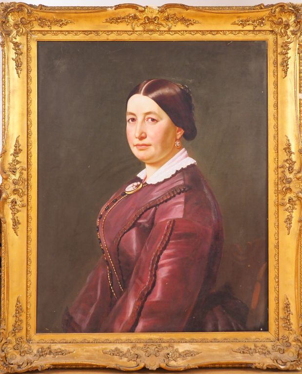 Ecole anglaise XIXème. "Portrait de dame à la robe pourpre". Huile sur toile. Dim. 87 x 69 cm