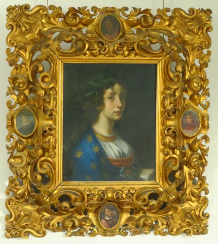 Ecole florentine XIXème 'Portrait de Muse'. Huile sur toile. 108 x 97 cm Très beau cadre en bois doré orné de quatre médaillons figurant des portraits
