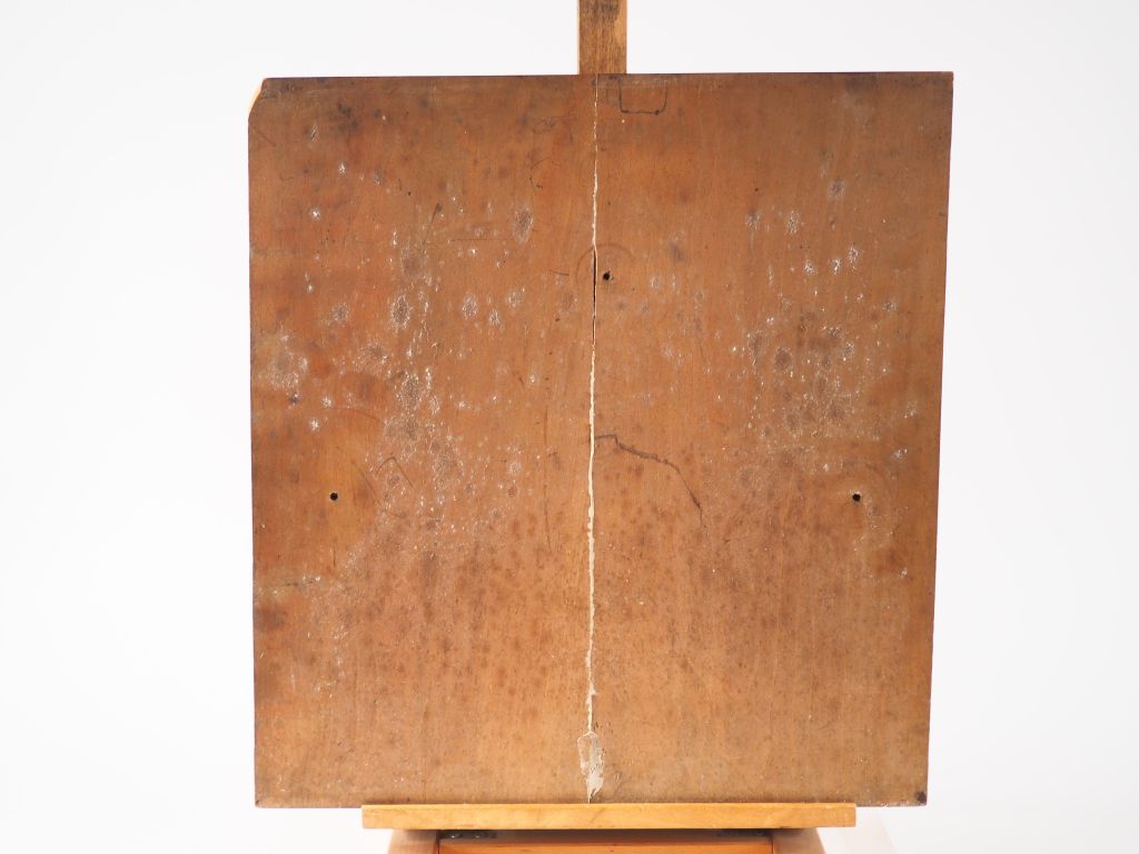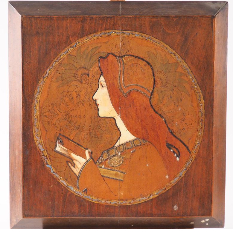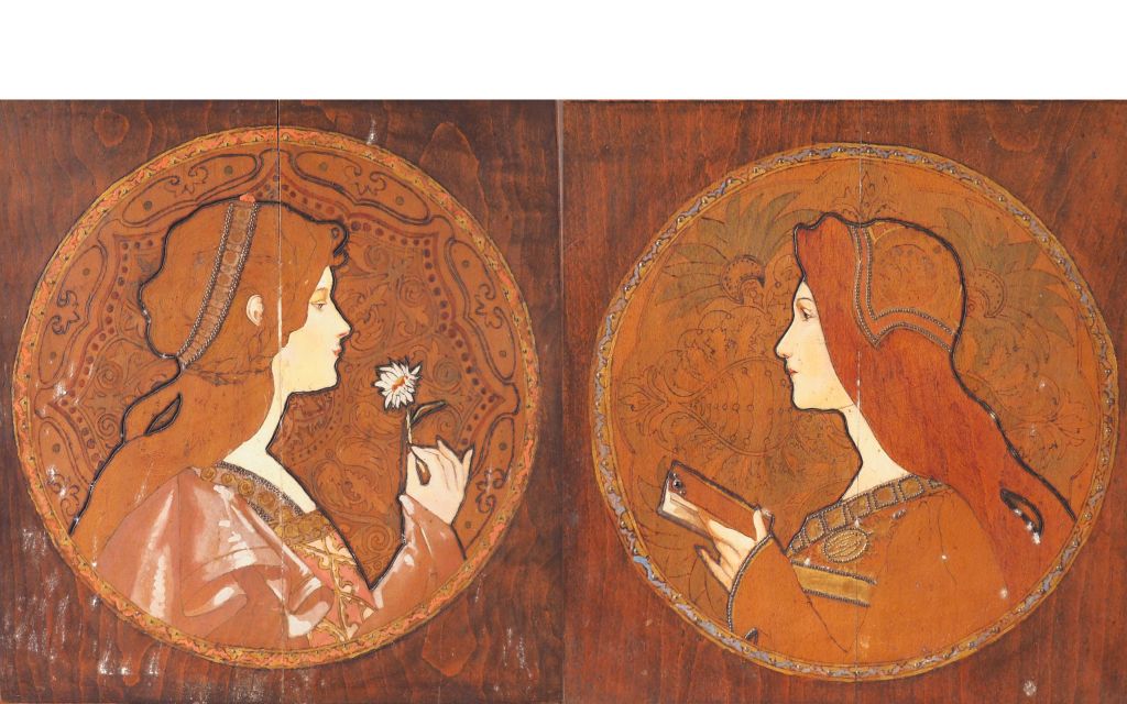 Ecole française 1900 "Jeunes femmes de profil". Paire de panneaux en bois peint pyrogravés et ornés de perles de verre en cabochon. Dim. 47 x 43,5 et 47,5 x 45 cm. (Panneaux fendus).