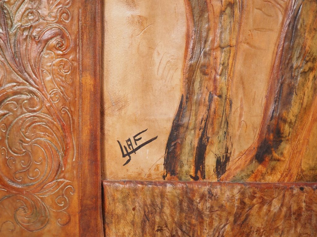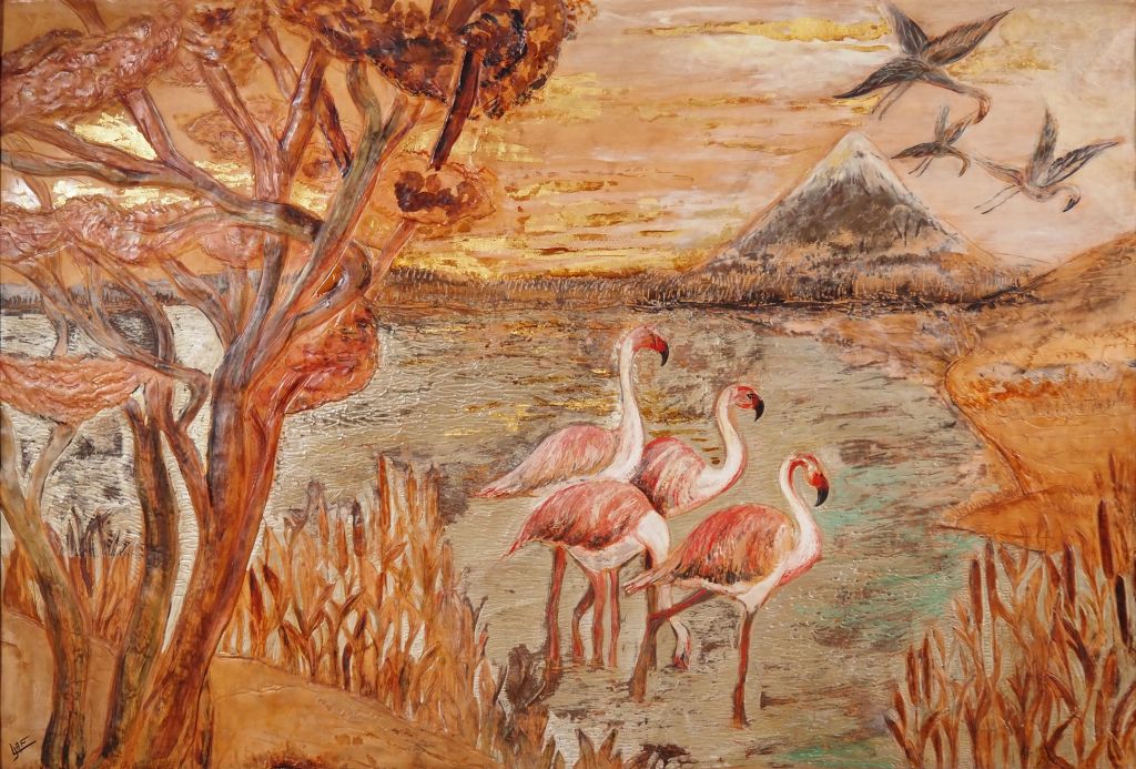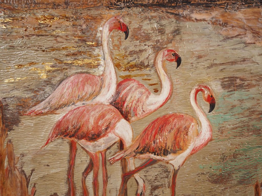 Ecole française XXème. "flamants roses dans un paysage lacustre" Grand panneau en cuir peint Dim. 110 x 186 cm