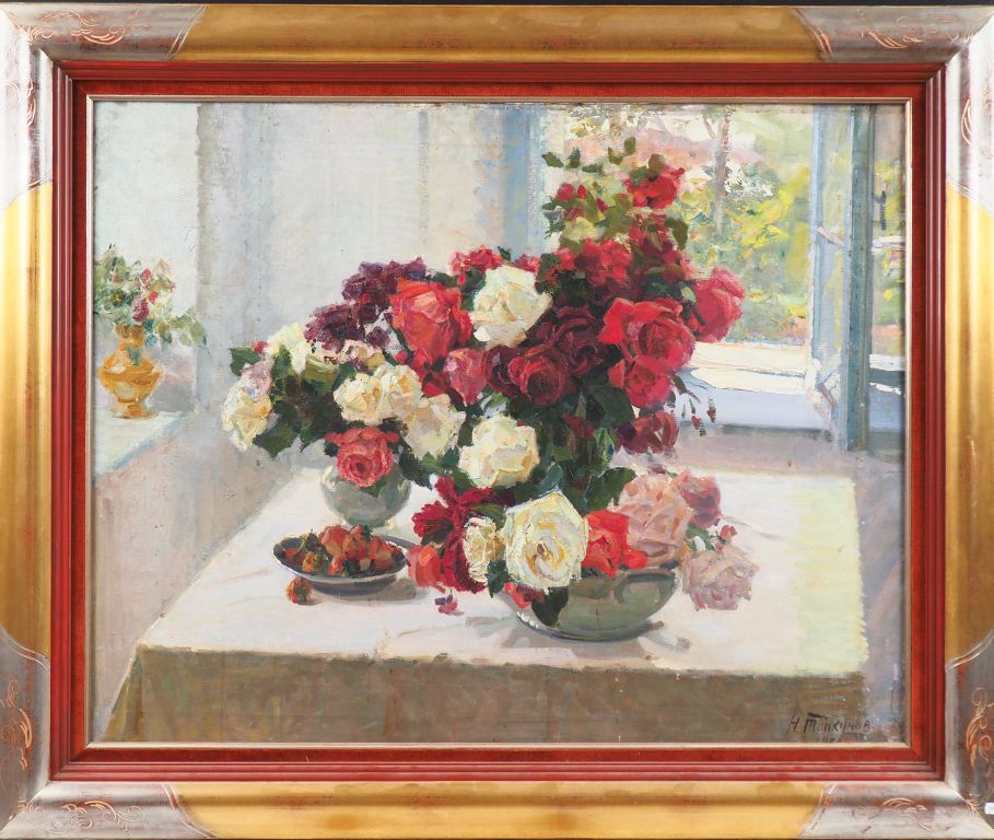 Ecole russe début XXème. "Nature morte aux bouquets". Huile sur toile, signée et datée en bas à droite. Dim. 75 x 95 cm.