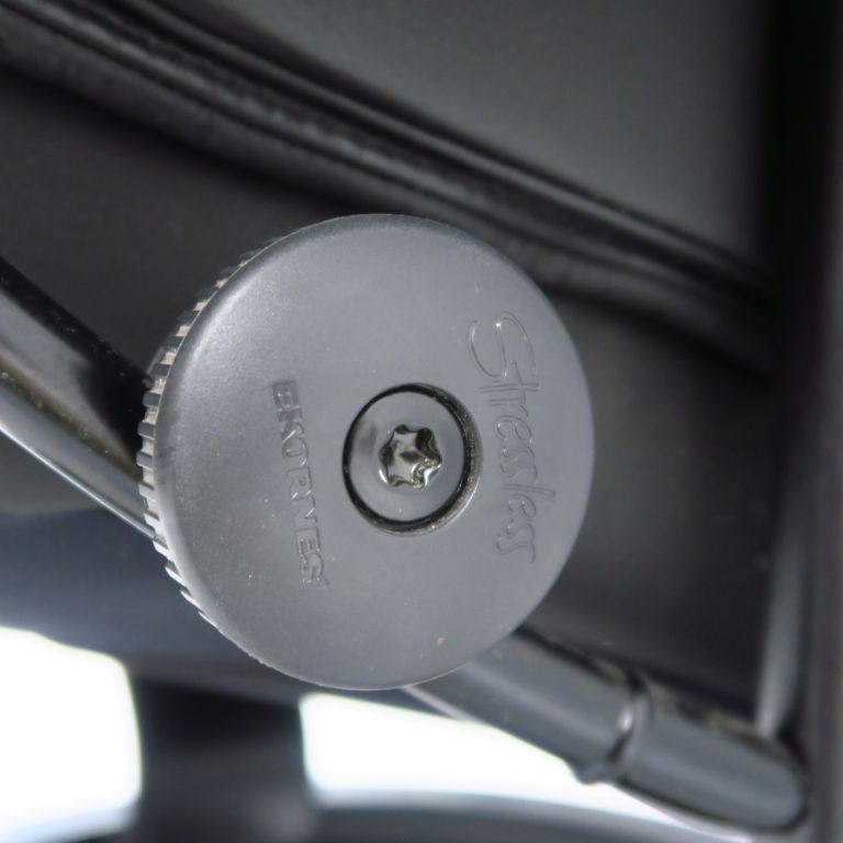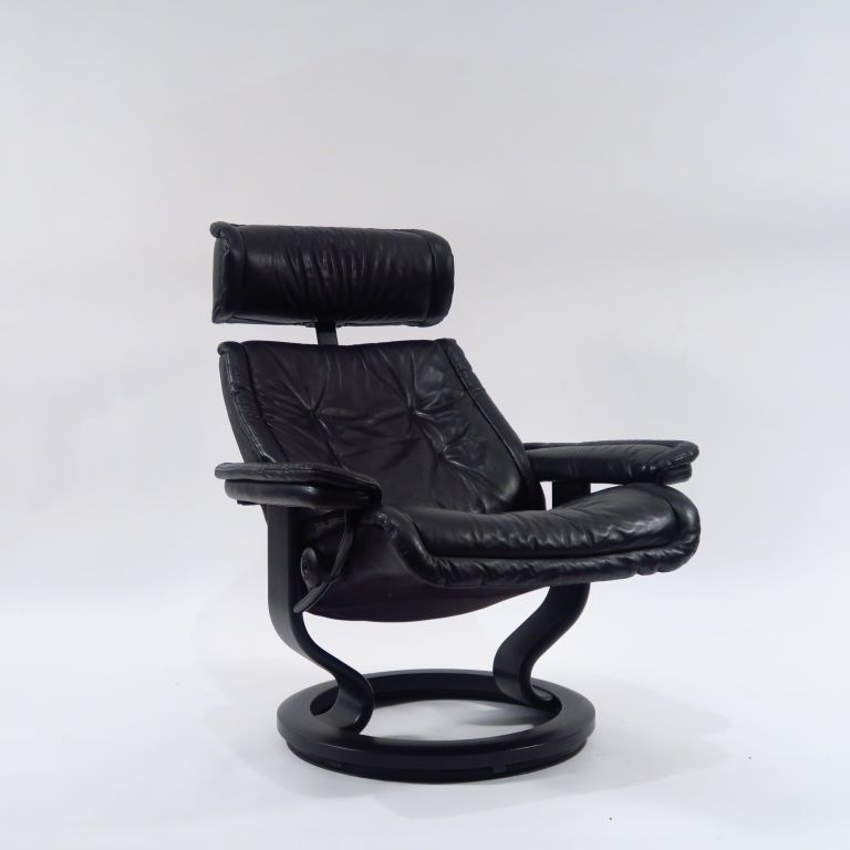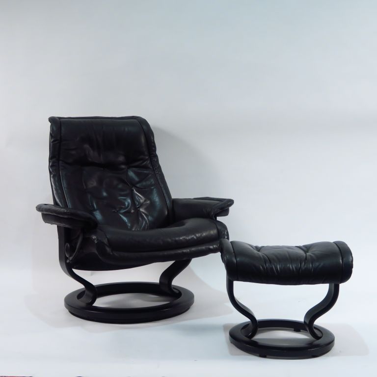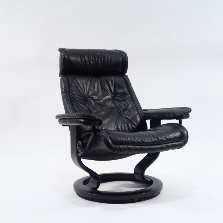 EKORNES. Suite de quatre fauteuils stresless et deux tabourets en cuir noir. (usures)