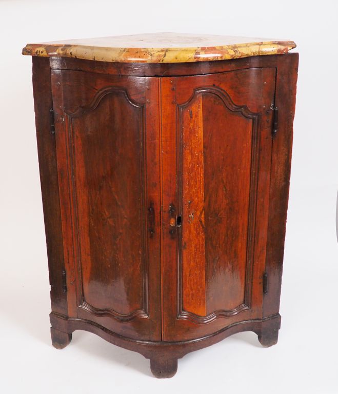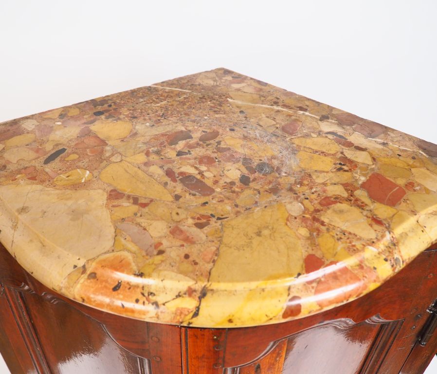 Encoignure Louis XV en noyer mouluré, ouvrant à deux portes cintrées, dessus marbre brèche. Dim. 86 x 70 x 41 cm. (accidents à la serrure, accident au marbre).