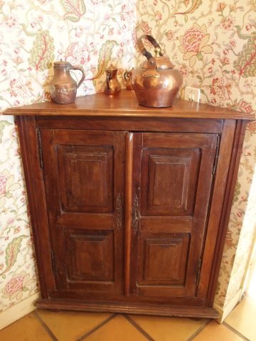 Encoignure rustique en bois naturel, ouvrant à deux portes à décor de motifs géométriques