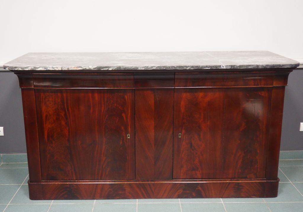 Enfilade Louis Philippe en acajou et placage d'acajou, ouvrant à deux portes et deux tiroirs à doucine. Dessus marbre noir. 99,5 x 197,5 x 71,5 cm. (marbre restauré)