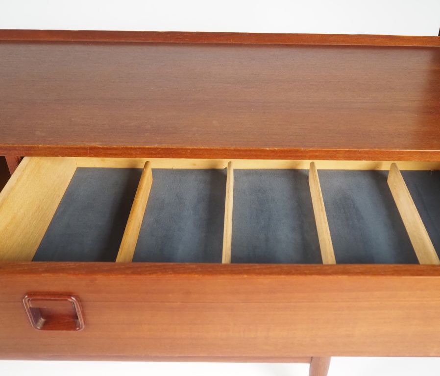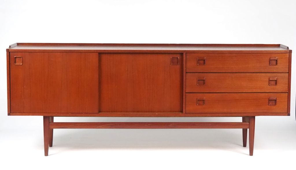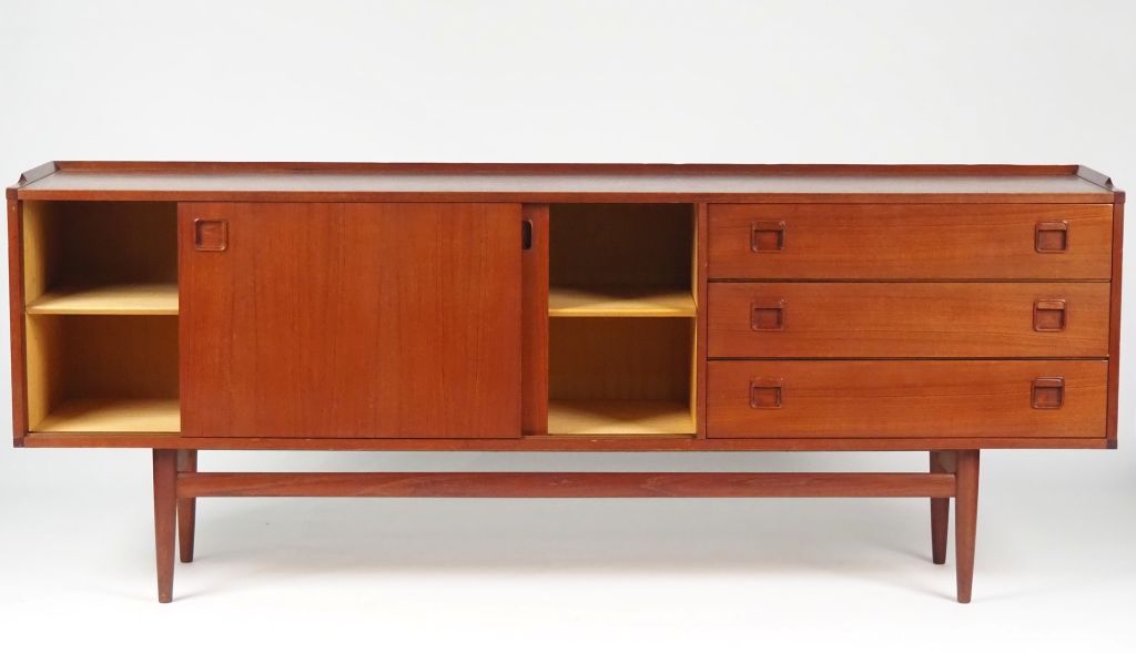 Enfilade scandinave en teck, ouvrant à trois tiroirs et deux vantaux coulissants. Dim. 68 x 200 x 44 cm