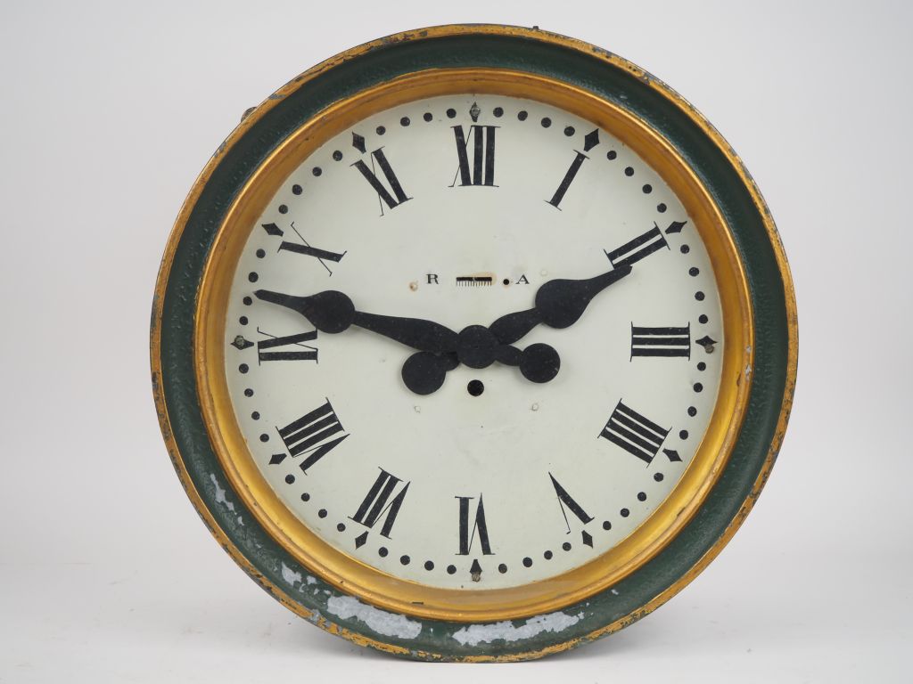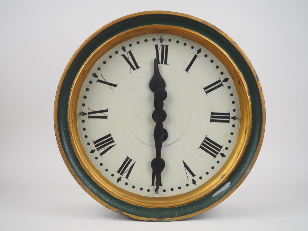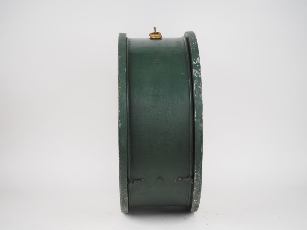 Enseigne de magasin début Xxème composée de deux horloges double face dans un tambour en métal peint vert, avec son mécanisme. Dim. 55 x 22 cm.