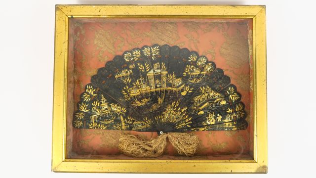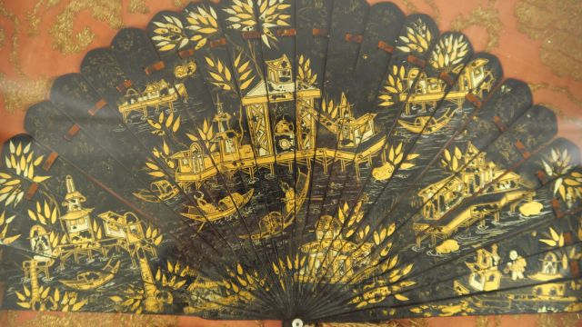 Eventail à feuilles brisées 1900 en laque, à décor de style Extrême-Orient doré sur fond noir. Dans son cadre d'origine.