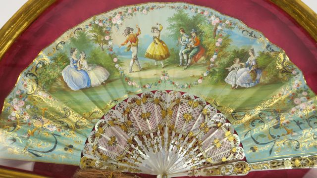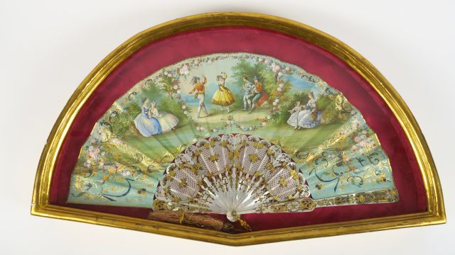 Eventail à feuilles pliées de style Louis XVI en nacre gravée, ajourée et dorée, à décor de scène de danse dans un parc. Dans son cadre à la forme.