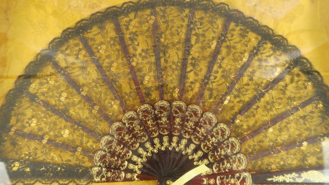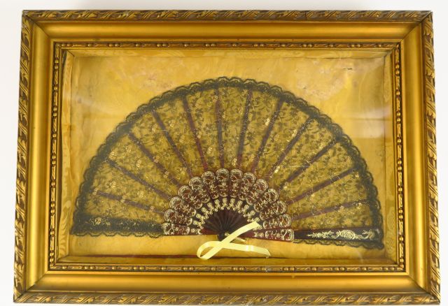 Eventail à feuilles pliées en dentelle, écaille brune et dorée. Dans un cadre rectangulaire.