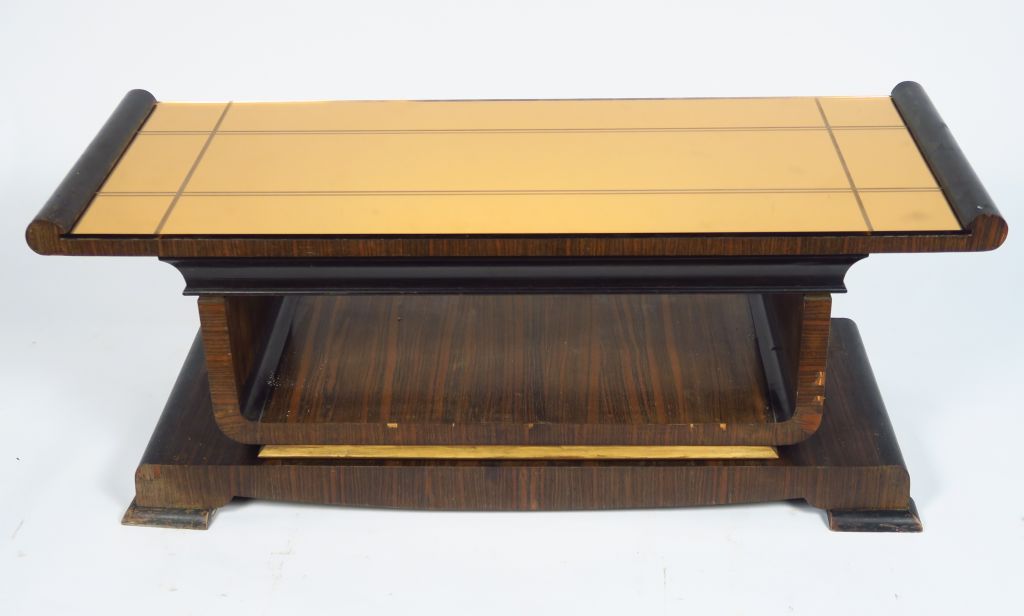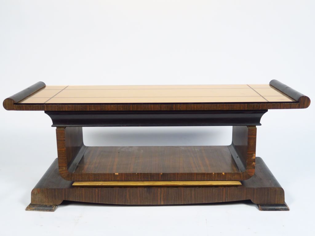 FAURE. Table basse en placage d'ébène de macassar et bois noirci. Dessus verre fumé. 50 x 122,5 x 45 cm