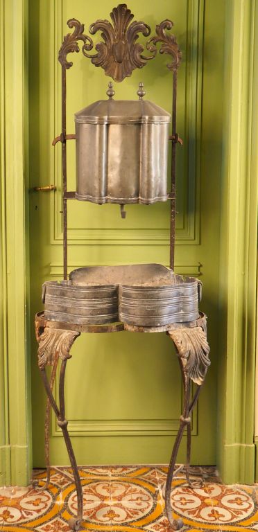 Fontaine et son bassin Louis XIV en étain sur un support présentoir en tôle et fer forgé. Dim. 197 x 60 x 42 cm