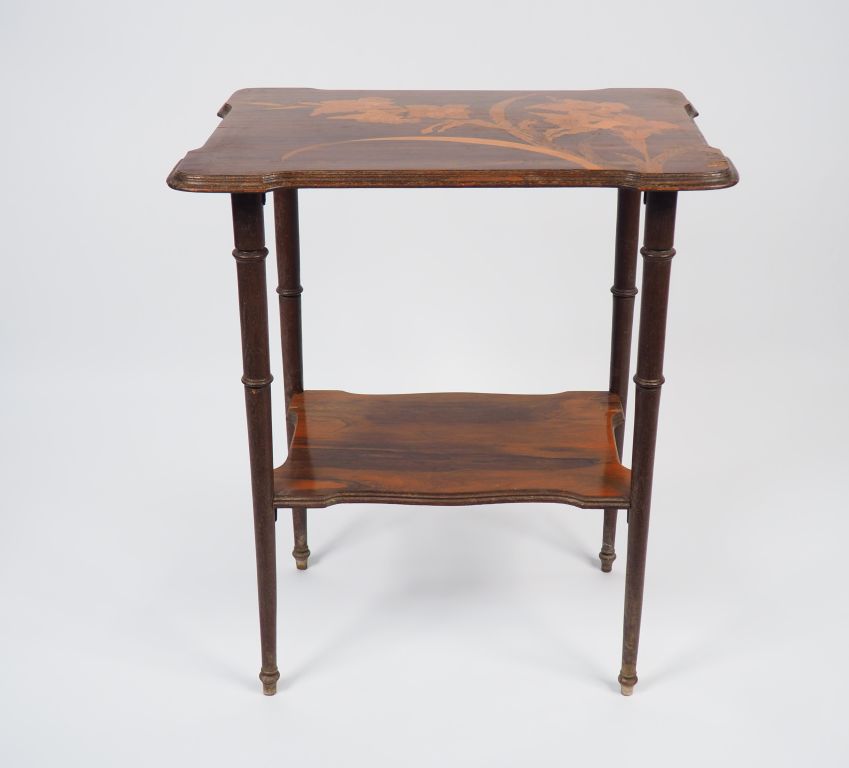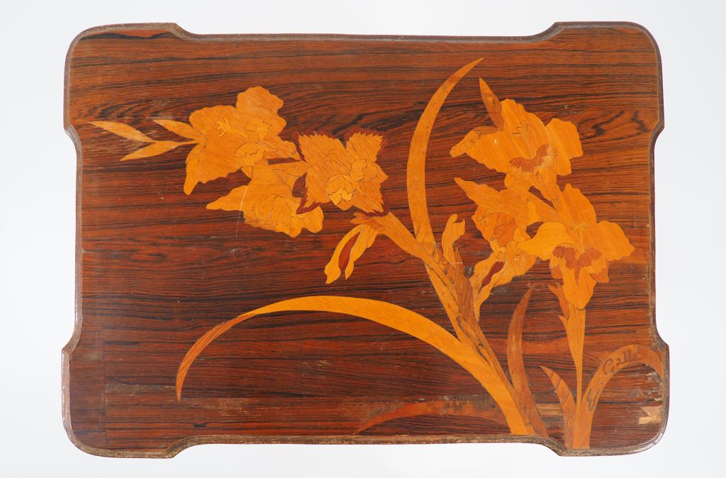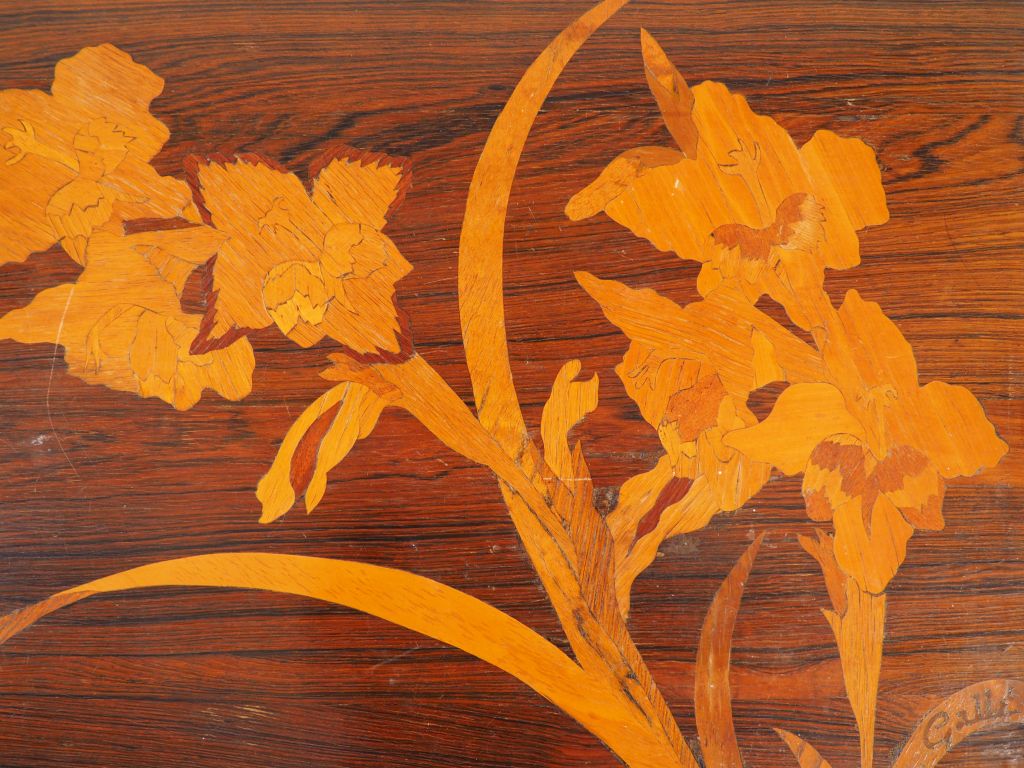 GALLE. Petite travailleuse à deux plateaux en marqueterie à décor de fleurs. Signée sur le plateau. Dim : 72,5 x 61 x 44 cm.