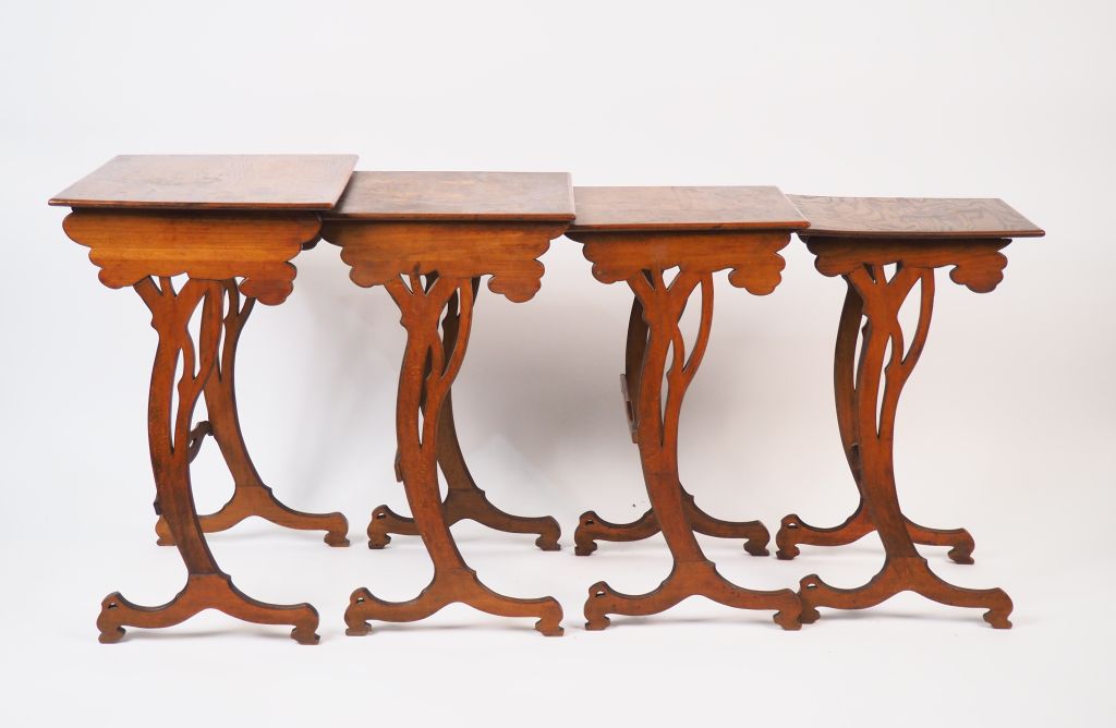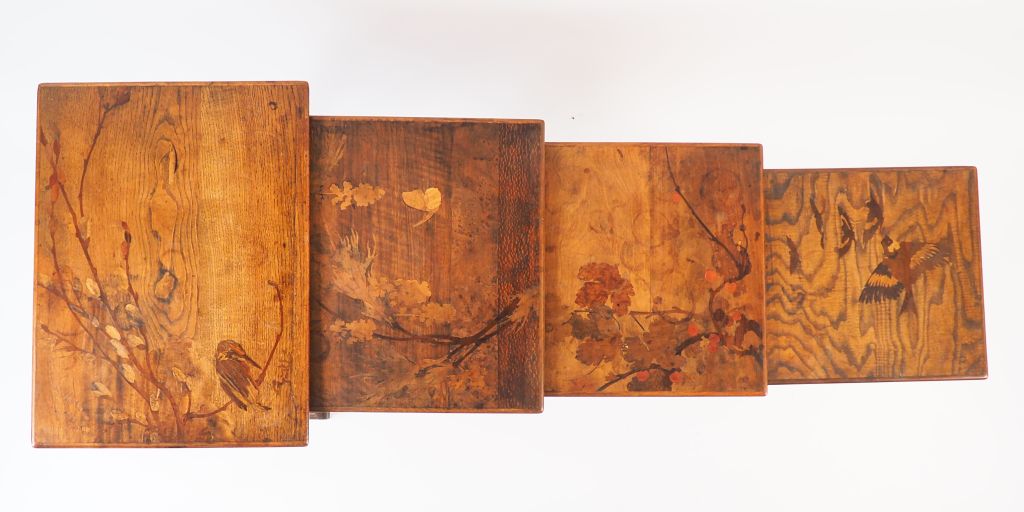 GALLE. Suite de quatre tables gigognes en marqueterie à décor d'oiseaux, de fleurs, d'insectes et de feuillage. (signature sur la plus grande) H. de la plus grande : 74 x 44,5 x 59,5 cm