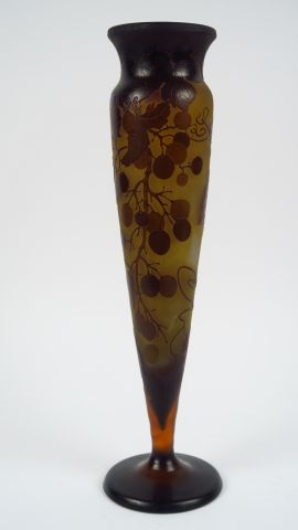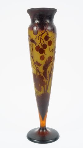 GALLE. Vase en verre à décor gravé en camée et à l'acide de vigne vierge mauve sur fond jaune. Signé. H. 42 cm