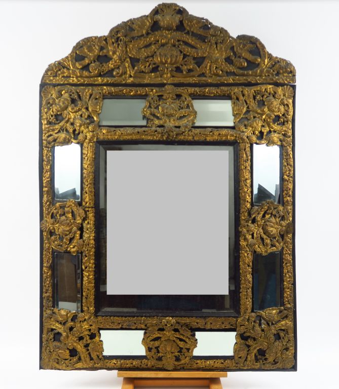 Glace à parecloses Louis XIV en bois noirci et laiton repoussé à décor de rinceaux et d'oiseaux. Dim. : 110 x 75 cm.