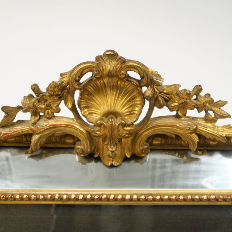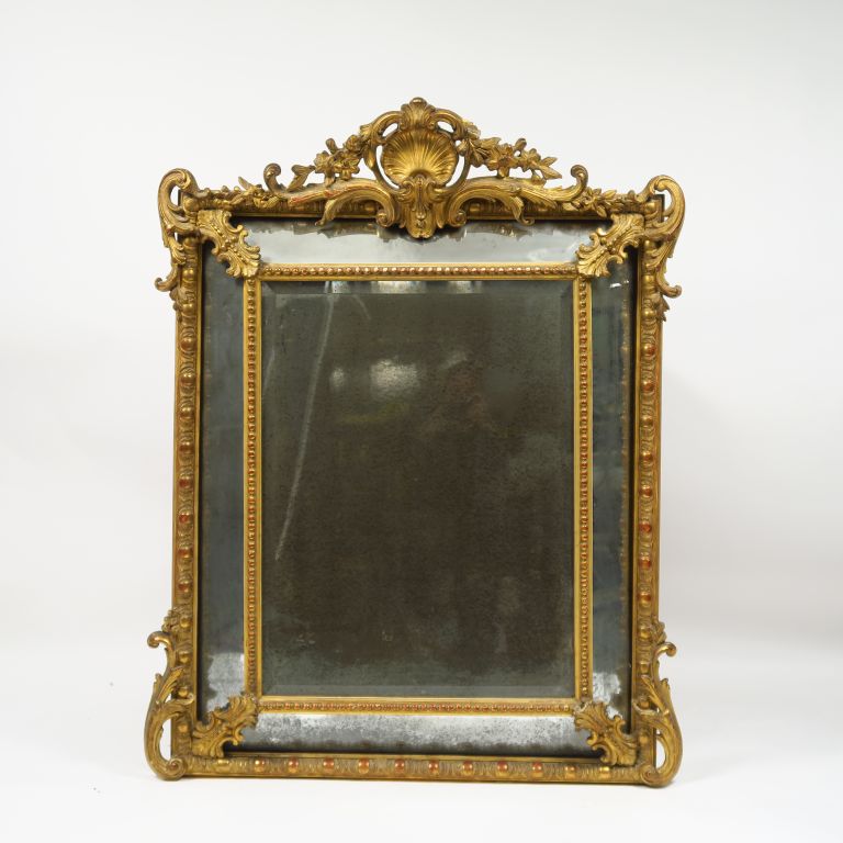 Glace à parecloses Napoléon III en bois et stuc doré, à décor de perles, de rinceaux et de coquille. (accidents). Dim. 118 x 92 cm